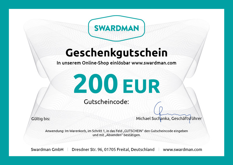 - Der auf dem Geschenkgutschein angegebene Wert wird beim Einkauf im Onlineshop www.swardman.com oder in unserem Geschäft Swardman GmbH, Dresdner Str. 96, 01705 Freital vom Gesamtpreis abgezogen. Der Gutschein kann nicht bei Swardman-Händlern eingelöst werden.