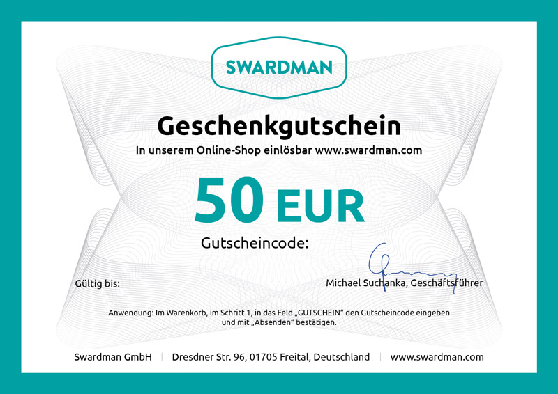 - Der auf dem Geschenkgutschein angegebene Wert wird beim Einkauf im Onlineshop www.swardman.com oder in unserem Geschäft Swardman GmbH, Dresdner Str. 96, 01705 Freital vom Gesamtpreis abgezogen. Der Gutschein kann nicht bei Swardman-Händlern eingelöst werden.