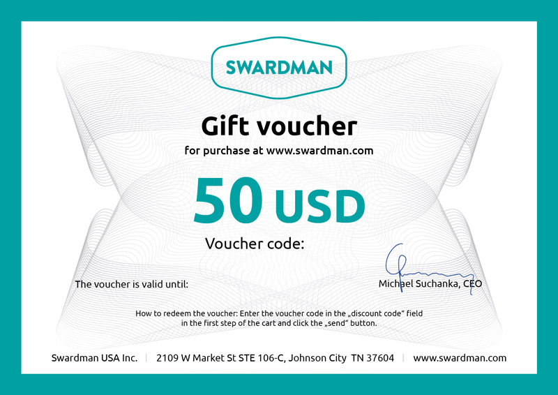 Gift voucher worth 50 USD for the purchase of goods from the www.swardman.com online shop.