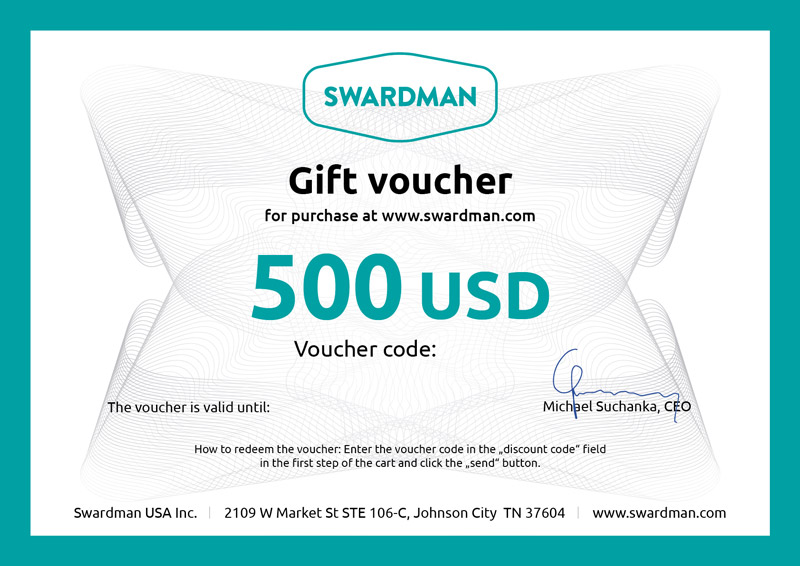 Gift voucher worth 500 USD for the purchase of goods from the www.swardman.com online shop.
